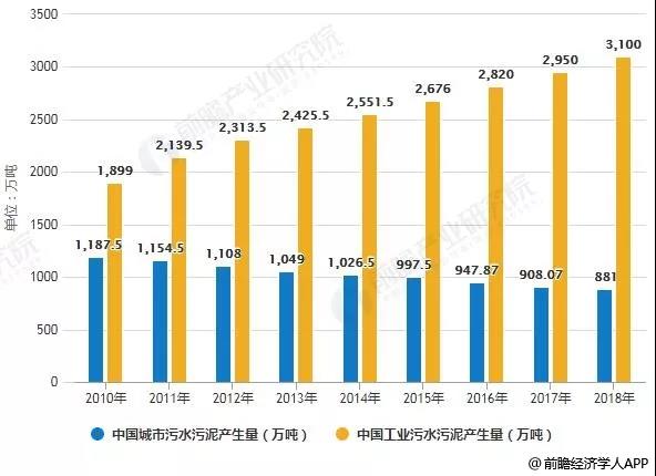 目前中國廢水排放總量越來越大,其中工業廢水排放量逐漸減少,城市生活廢水排放量逐年增大。據前瞻產業研究院發布的《中國污泥處理處置深度調研與投資戰略規劃分析報告》統計數據顯示,2010年中國城市污水污泥產生量已達1187.5萬噸,工業污水污泥產生量亦達1889萬噸,目前中國廢水排放總量越來越大,其中工業廢水排放量逐漸減少,城市生活廢水排放量逐年增大。截止至2017年中國城市生活廢水約為590億噸,中國城市污水污泥產生量達到了908.07萬噸,工業污水污泥產生量亦達到了2950萬噸。預計2018年中國城市污水污泥產生量將下降至881萬噸。而工業污水污泥產生量將超3000萬噸。